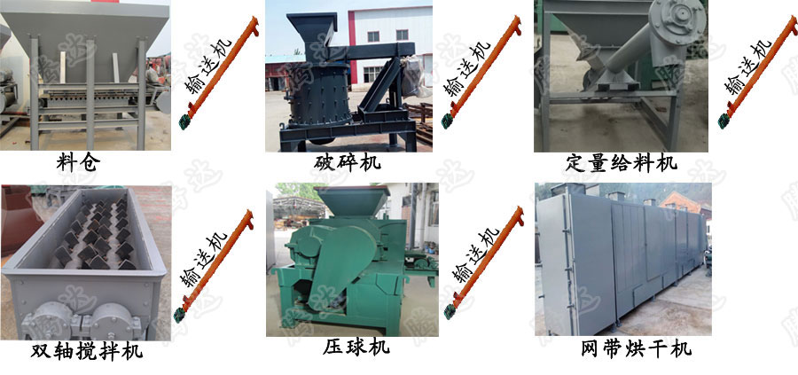 【主要設備】:定量給料機、粉碎機、雙軸攪拌機、粘合劑攪拌桶(干粉粘合劑給料機)、型煤壓球機、型煤烘干機