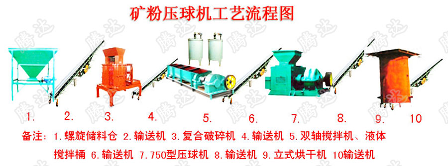 礦粉→供料機(jī)→攪拌機(jī)→礦粉壓球機(jī)→立式烘干機(jī)→成品